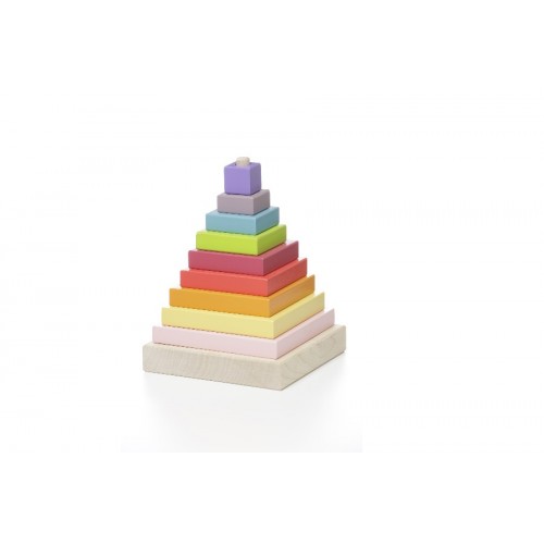 Это классическая пирамидка. Ключевая часть игрушки – деревянное основание квадратной формы. В центре основания закреплен штырек, на который малыш должен нанизывать остальные детали. Все элементы пирамидки окрашены в разные цвета и знакомят малыша со всеми цветами радуги. Имея одну форму, повторяющую форму основания, они отличаются по размеру. Чтобы сложить классическую пирамиду, малыш должен нанизать ее части от большей к меньшей снизу вверх. Самым верхним элементом, пиком пирамиды, окажется маленький кубик.