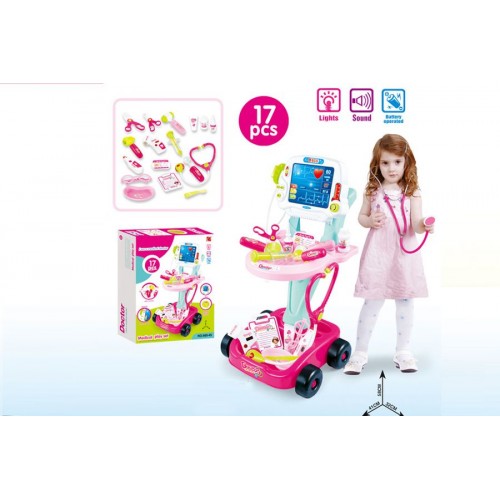 • Набор доктора на тележке достаточно мобилен и малыш сможет быстро оказать помощь своим пациентам. В этом ему помогут, входящие в набор, ножницы, очки, лупа, шприц, лоточек для шприца, стетоскоп, тонометр, фонендоскоп, молоточек, баночка с крышкой. Возможно, именно с этого набора у будущего врача начнется любовь к медицине.В состав набора входит:- ножницы -1 шт.,- очки – 1 шт.,- лупа – 1 шт.,- шприц – 1 шт.,- лоток для инструментов – 1 шт.,- стетоскоп (для выслушивания сердца и лёгких) – 1 шт.,- тонометр (для измерения давления) – 1 шт.,- отоскоп (инструмент лор-врача) – 1 шт.,- молоточек – 1 шт.,- стаканчик с крышкой – 1 шт.