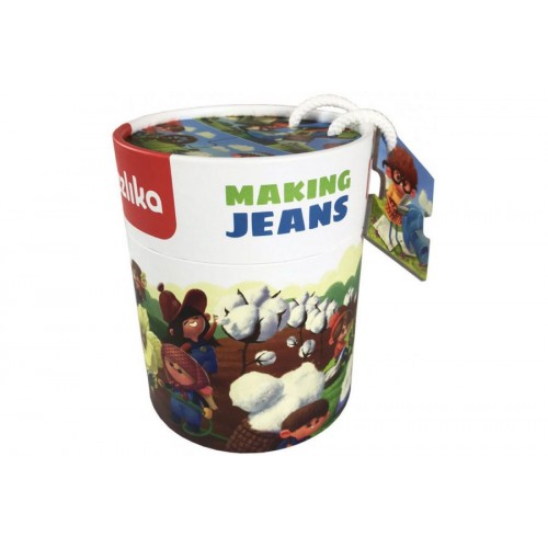 Собирая последовательно картинки в пазл ребенок знакомится с процессом изготовления джинсов с момента выращивания льна к моделированию и пошиву брюк.