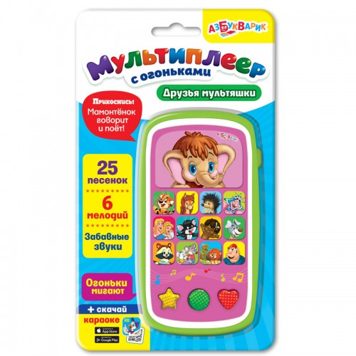 Более 30 весёлых песенок и мелодий – в новом мультиплеере («Песенка Мамонтёнка», «Частушки Бабок-Ёжек», «Какой чудесный день!», «Чунга-чанга»). Пой с Мамонтёнком и другими мультяшками, танцуй под любимые хиты – развивай свои таланты. Разноцветные огоньки на фигурных кнопочках мигают под музыку!