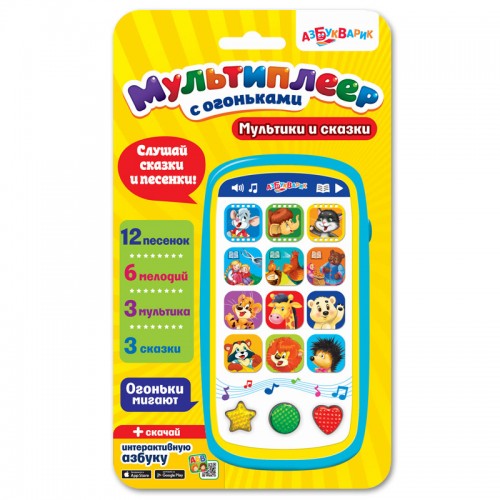 Ваш малыш любит мультики и сказки? Тогда этот мультиплеер – для него. На ярких кнопочках – 12 весёлых мультяшек (Крошка Енот, Львёнок, Умка, Мышонок и др.), которые рассказывают сказки ("Гуси-лебеди", "Маша и медведь", "Петушок и бобовое...