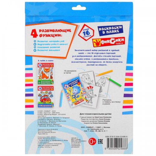 Эта уникальная раскраска в папке «Фиксики» - новинка ТМ «УМка» специально для самых маленьких. Листы для раскрашивания изготовлены из высококачественной белой плотной бумаги и сложены в картонную папку с яркими иллюстрациями. Малыши могут раскрашивать каждую страницу с изображением любимого персонажа отдельно. Изображения крупные без мелких деталей, имеют толстые чёткие контуры, чтобы дети их хорошо видели и не выходили за край. Занятия с набором развивают внимание, память, фантазию, воображение, координацию движений, усидчивость и мелкую моторику рук. Готовят руку к письму, расширяют кругозор, учат различать цвета и раскрашивать. Формат: 205*280 мм. Объём: 16 листов. Рекомендовано для детей старше 2 лет
