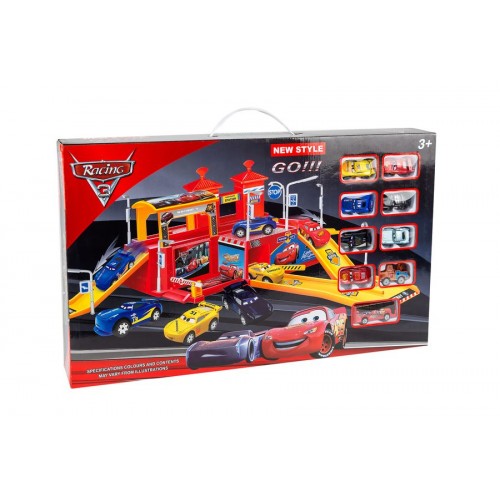 . По цветовому решению парковка соответствует стилистике анимации «Тачки». Элементы декораций, которые входят в набор дополняют и совершенствуют парковку. Позвольте малышам развлечься с любимыми героями на парковке, собранной собственными руками. В набор входит: детали гаража, наклейки, декорации и 8 машинок.